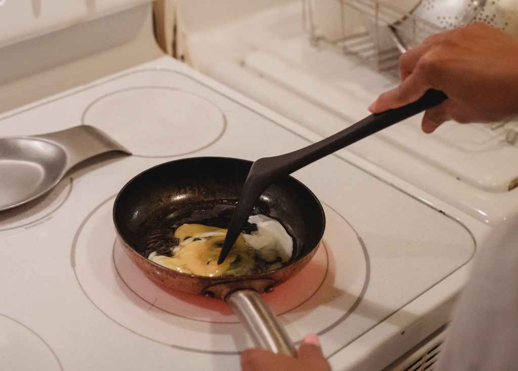 3. Add the eggs to the same pan and scramble them with a spatula, constantly stirring until cooked. Season with salt and pepper to taste.