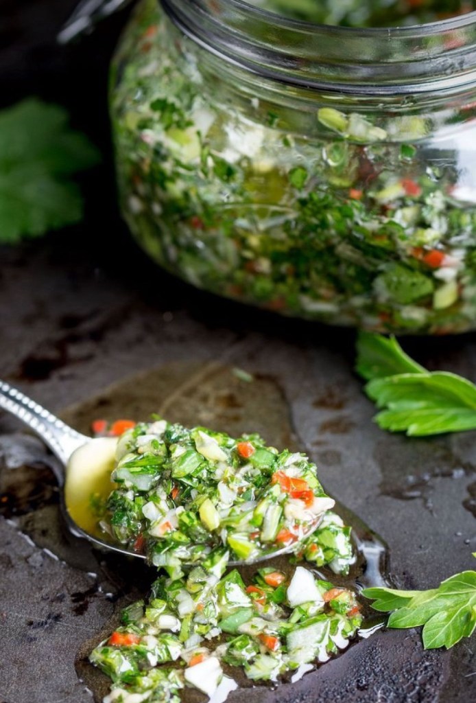 A popular sauce in Argentine cuisine, typically served as a condiment for grilled meats. It’s known for its vibrant green color and bold, herbaceous flavor. The sauce is made primarily from fresh herbs, garlic, oil, and vinegar, with variations in ingredients and proportions depending on personal taste and regional preferences.