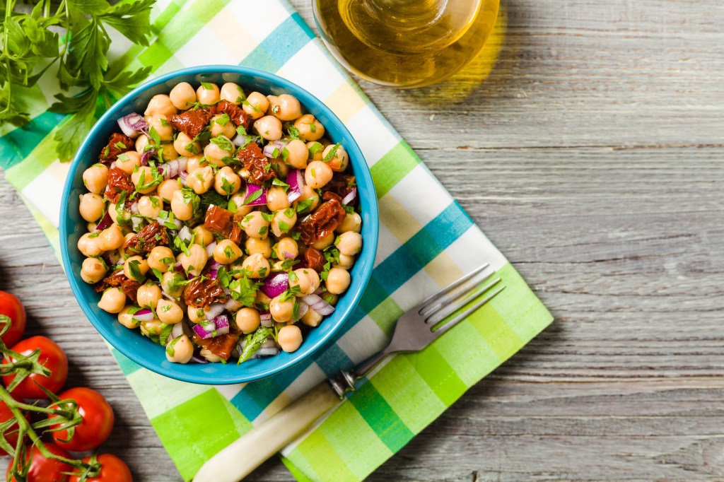 - In a large bowl, combine chickpeas, tomatoes, cucumber, onion, olives, and herbs.